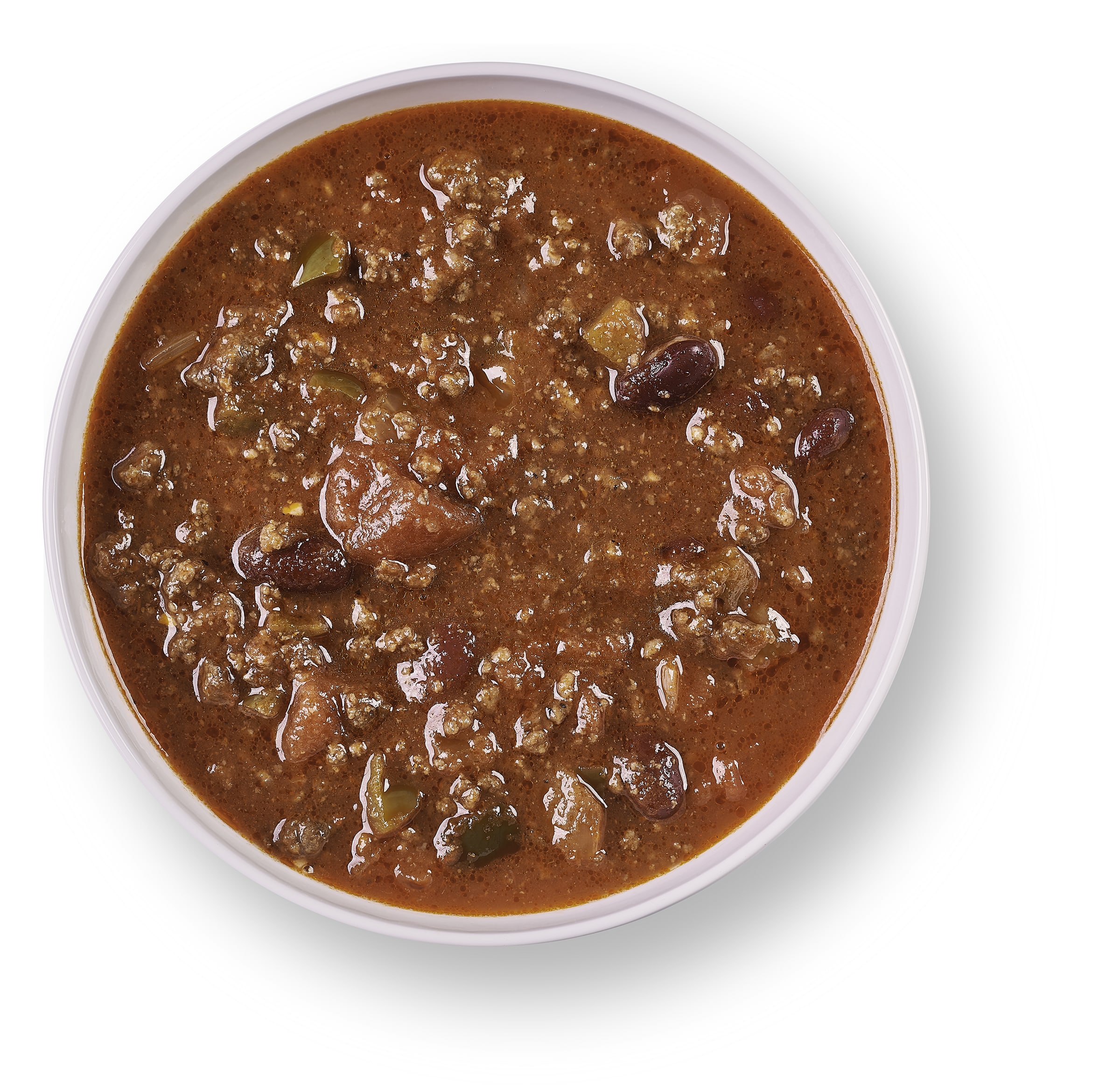 Water, ground beef, red kidney beans (red kidney beans, water, salt, calcium chloride, disodium EDTA), tomato paste, tomatoes (tomatoes, tomato juice, calcium chloride, may contain citric acid), green peppers, vinegar, onions, sugar, canola oil, beef extract type flavour (beef stock, maltodextrin, flavour, salt, yeast extract), salt, dehydrated garlic, chili powder (spices, salt, herbs, garlic), spices.