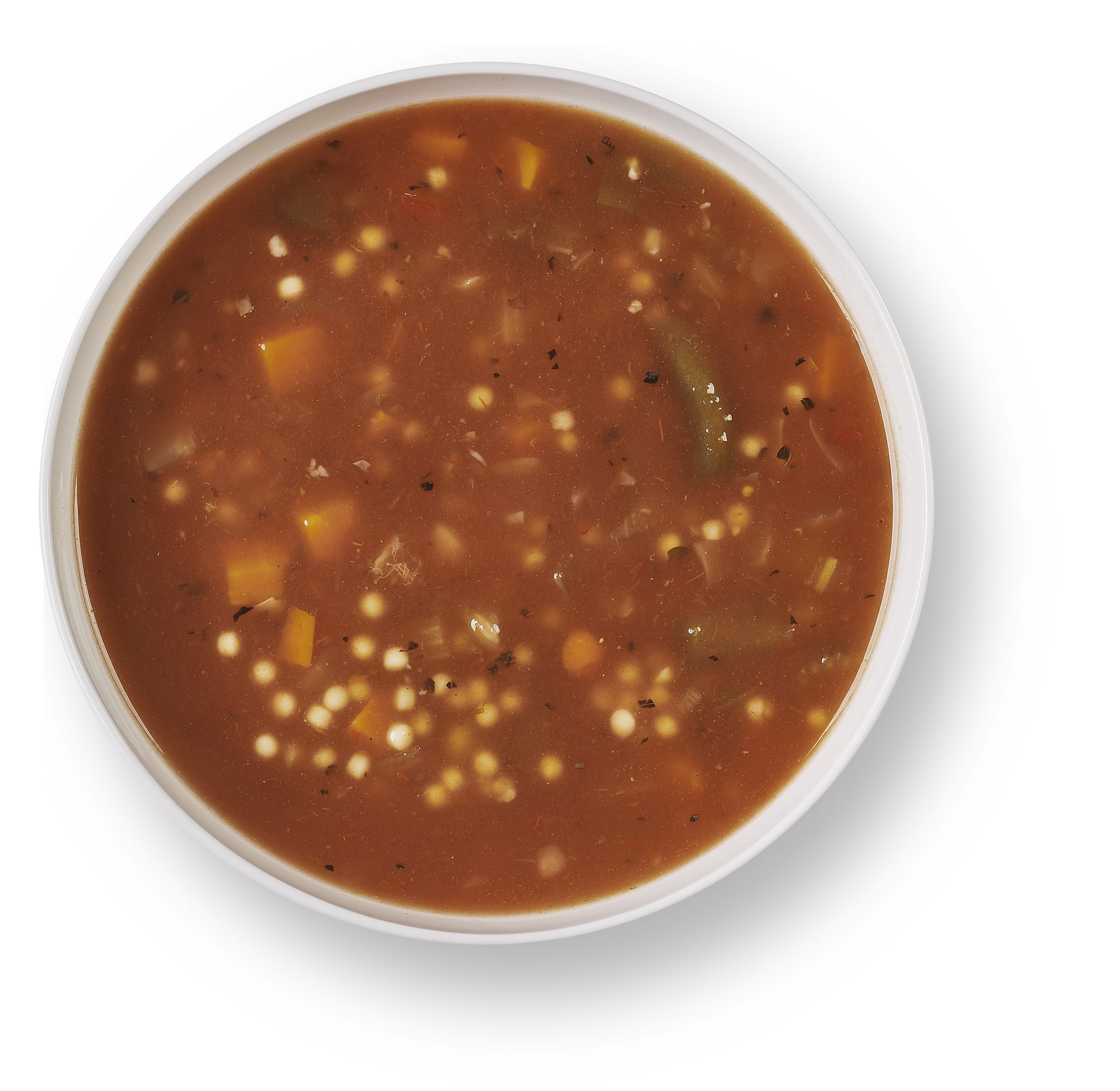 Water, tomatoes (tomatoes, may contain water and citric acid), lima beans, red kidney beans (red kidney beans, water, salt, calcium chloride, disodium EDTA), pasta (durum semolina, niacin, ferrous sulphate (iron), thiamine mononitrate (Vitamin B1), riboflavin (Vitamin B2), folic acid), tomato paste, celery, carrots, onions, cabbage, modified tapioca starch, green peppers, red peppers, green beans, corn starch, salt, yeast extract, vegetable broth flavour (yeast extract, salt, carrot powder, tomato powder, onion powder, leek powder, garlic powder, herbs and spices (bay leaf, celery, thyme), salt replacer (sea salt, potassium chloride, yeast extract, vegetable oil (canola oil), silicon dioxide), dehydrated garlic, spices.